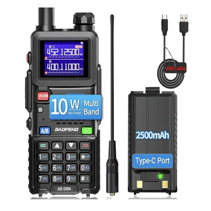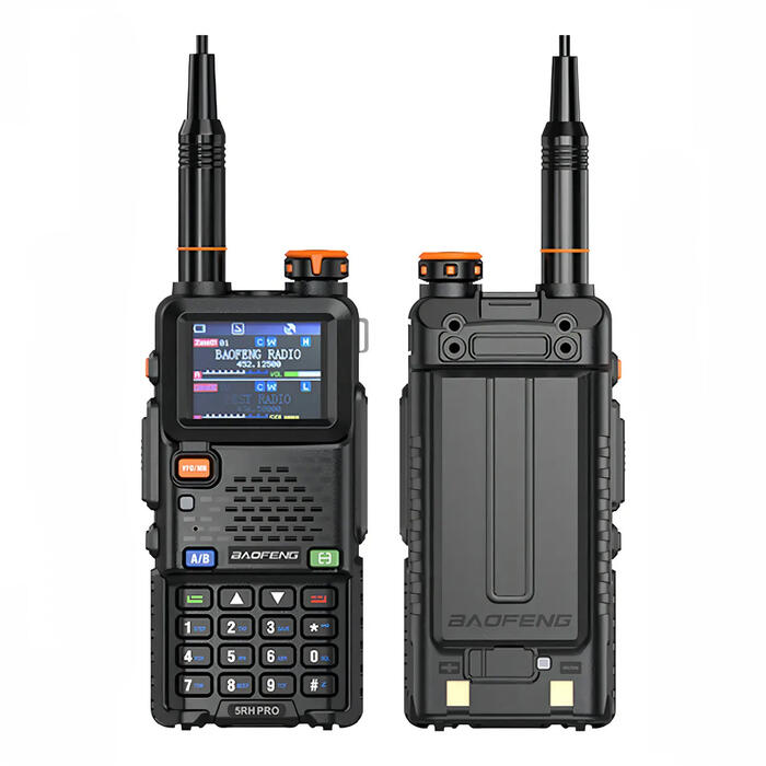 El Baofeng UV-5RH es una radio de alta potencia (10W) con doble banda (VHF/UHF) y una pantalla a color. Este modelo avanzado incluye características como carga por USB-C, 999 canales de memoria, una linterna integrada y funciones de búsqueda de frecuencia rápida. Es un equipo robusto diseñado para comunicaciones de largo alcance en actividades al aire libre, emergencias y operaciones de seguridad.